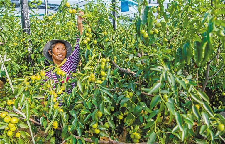 大荔县赵渡镇平民村冬枣大棚里,村民正在进行冬枣后期管理(资料照片)。记者 袁景智摄